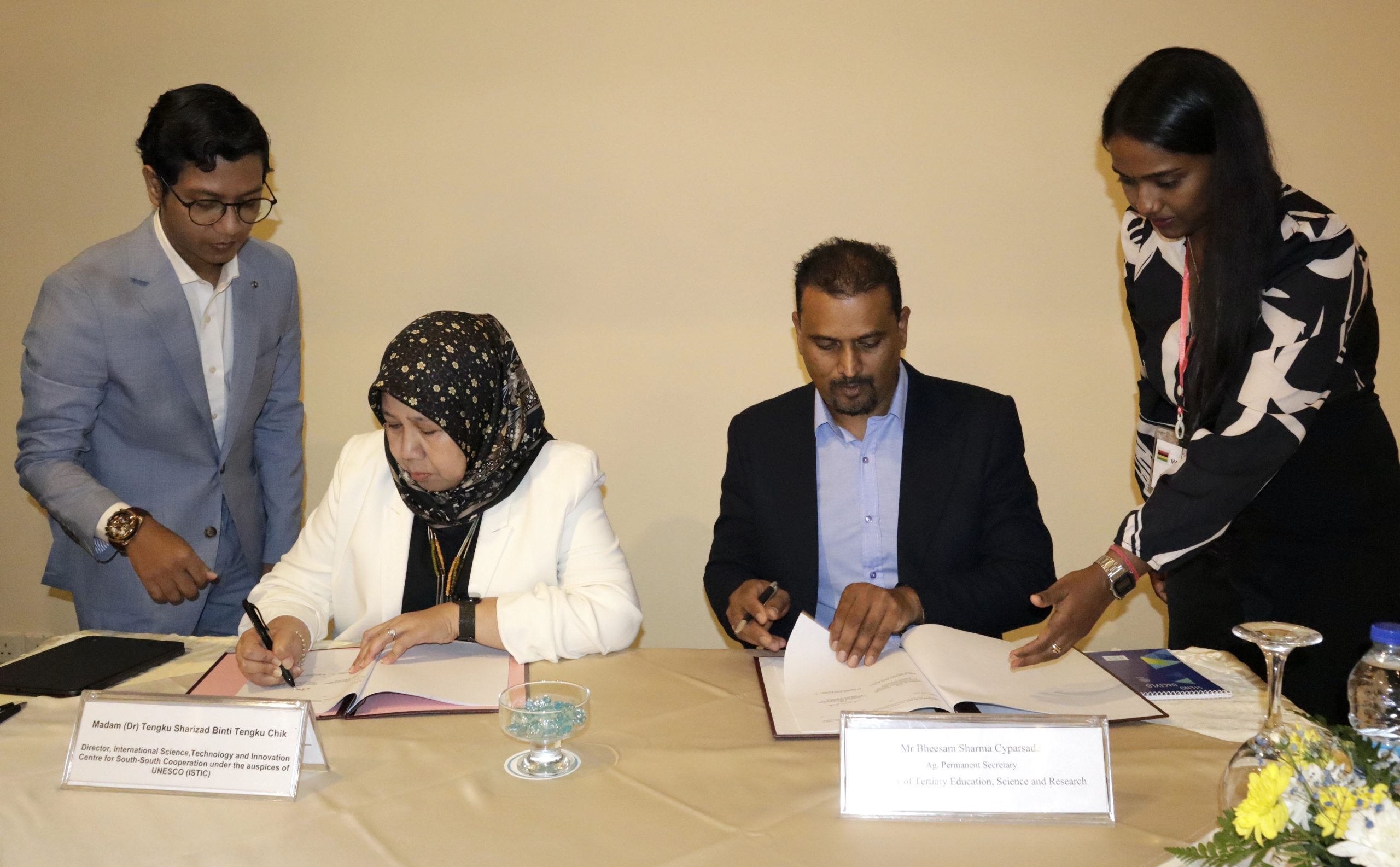 The workshop officially opened with the MoU signing ceremony between the Ministry of Tertiary Education, Science and Research and the International Science, Technology and Innovation Centre for South-South Cooperation under the auspices of UNESCO (ISTIC). This agreement represents a significant step toward strengthening collaboration and fostering dialogue on key issues related to the development of the blue economy. The MoU was signed by Madam Tengku Sharizad Binti Tengku Chik, Director, International Science, Technology and Innovation Centre for South-South Cooperation under the auspices of UNESCO and Mr Bheesam Sharma Cyparsade, Ag. Permanent Secretary, Ministry of Tertiary Education Science and Research.