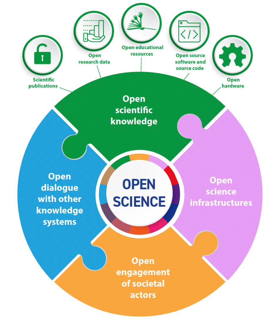 Open science promotes the broad and equitable access to scientific knowledge, including publications, data, methods, and tools, by encouraging transparency, collaboration, and public engagement. It seeks to make science more inclusive and participatory, enabling both professionals and non-specialists to contribute to and benefit from research.